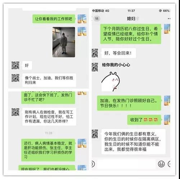 隔离病区的蒋永中医生和检验科翟茵因工作结识,本来计划过完春节订婚,由于疫情突发,两人约定推迟到疫情结束。他们每天坚守在各自的“战场”上,只能通过手机微信互报平安。
