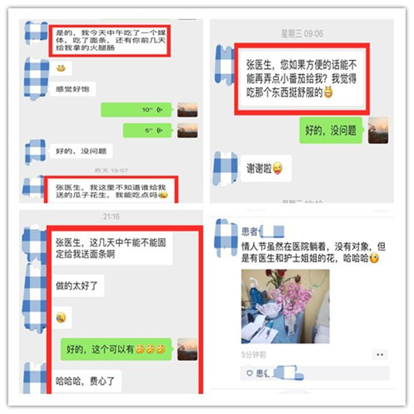 隔离病区的患者刚入院时出现药物性肝损害、恶心、呕吐,医护人员为了给他补充营养,联系单位餐厅变着花样为患者做吃的。患者情绪不稳,医生查房时除了关心病情,多次鼓励他树立信心,同病魔做斗争。生活上,无微不至关心患者,送饭、送水果、送零食、送花,尽量满足要求,患者同医生说六院单位餐厅的面条做的太好吃了。