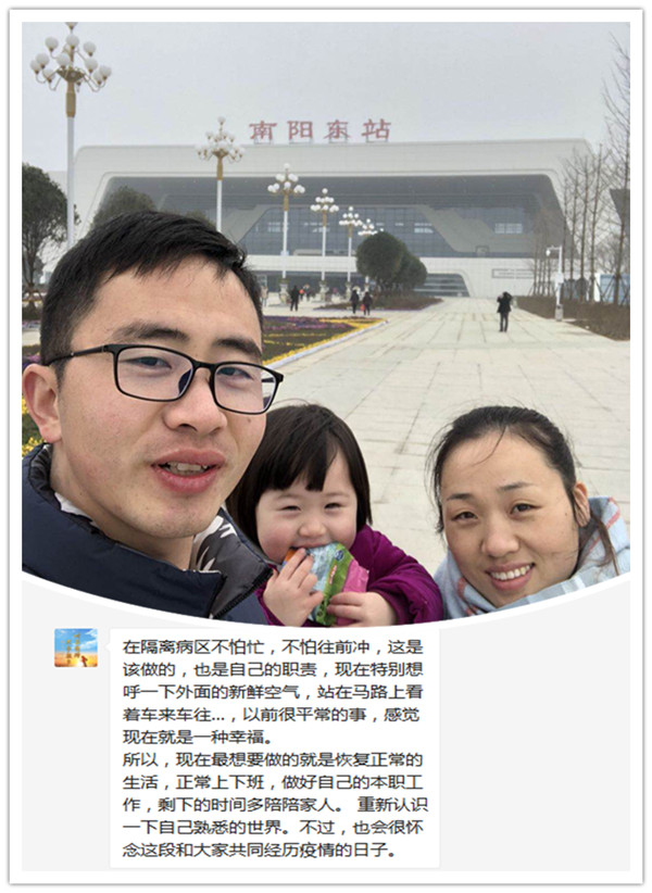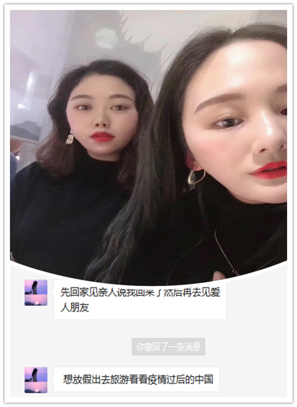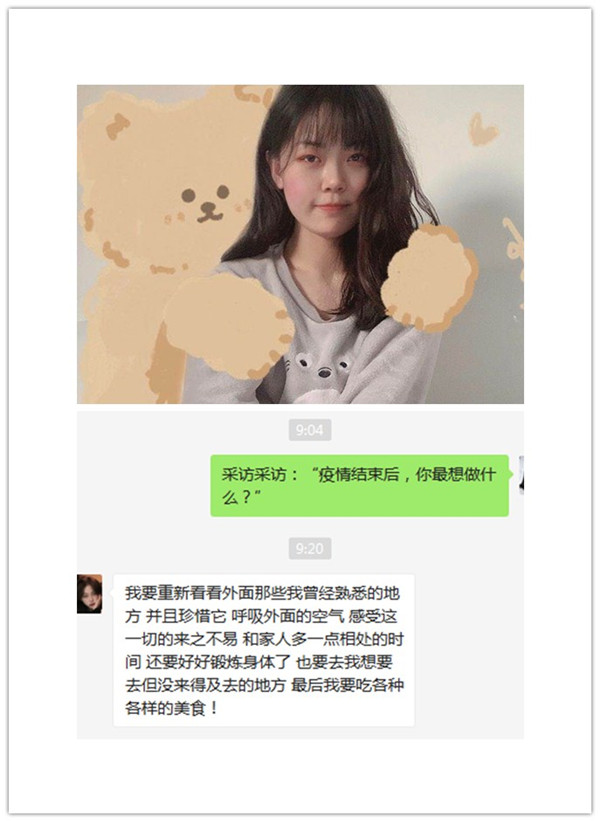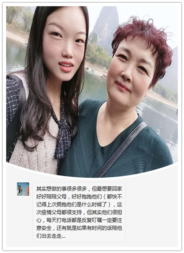 张倩倩:其实想做的事很多很多,但最想要回家好好陪陪父母,好好抱抱他们(都快不记得上次拥抱他们是什么时候了),这次疫情父母都很支持,但其实他们很担心,每天打电话都是反复叮嘱一定要注意安全,还有就是如果有时间的话陪他们出去走走…