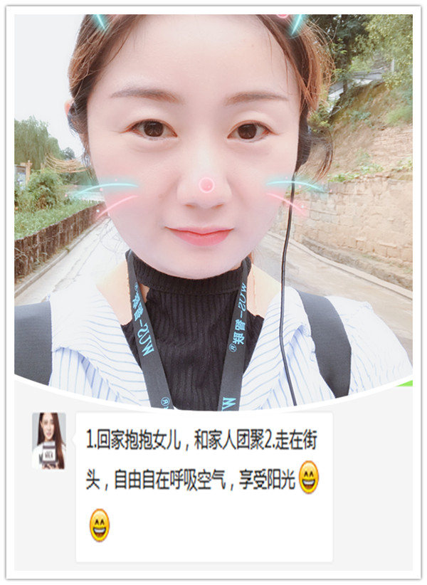 冯静双:1、回家抱抱女儿,和家人团聚2、走在街头,自由自在呼吸空气,享受阳光!