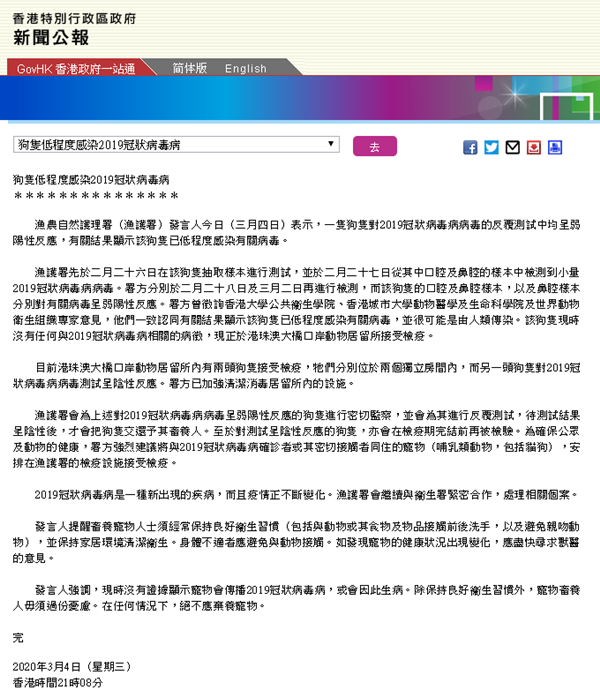 4日,渔护署表示,有关结果显示这只狗已经低程度感染病毒,成为世界首例。渔护署曾征询港大、城市大学及世界卫生组织意见,专家一致认同并认为很大可能是由人类传染的。但渔护署同时也强调,目前没有证据显示宠物会传播新冠病毒,或因此生病。并表示除良好卫生习惯外,毋需过分忧虑,任何情况下不应该弃养宠物。有兽医认为,不能排除狗的鼻腔或口腔适合病毒存活,但此情况并不代表会发病或引发传播。